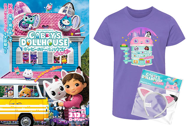 世界中の子どもたちから絶大な人気を誇るドリームワークス・アニメーション製作のテレビアニメシリーズを映画化した「ギャビーのドールハウス ザ・ムービー」のTシャツ(キッズ用)と猫耳ヘアバンドのセットを5名様にプレゼント。